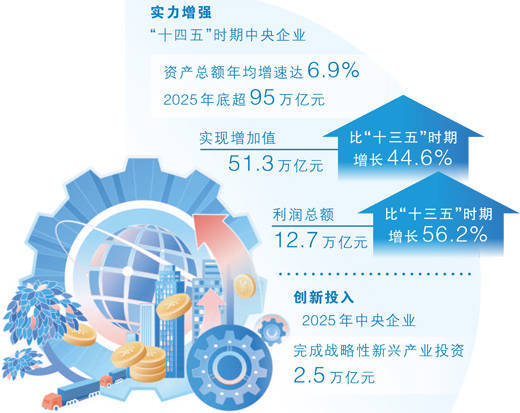 r2025年,中央企业实现利润总额2.5万亿元,完成固定资产投资5.1万亿元,上交税费2.5万亿元。截至2025年底,中央企业资产总额突破95万亿元。
